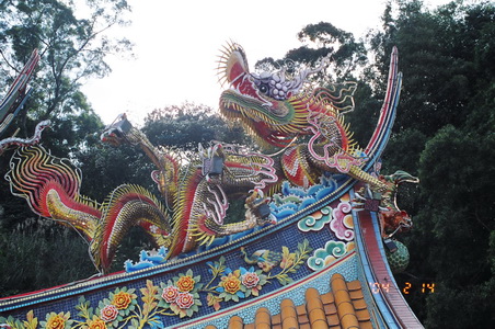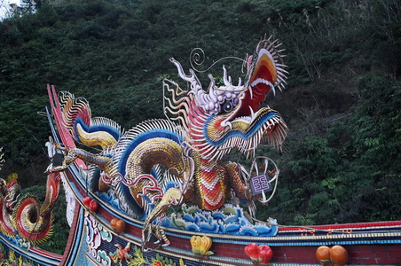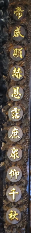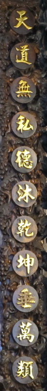 正大門對聯曰:玉闕巍峨,三十六天統歸掌轄;尊恩浩蕩,七十二地盡受帡幪。」殿上圓形及八卦形結網象徵天圓地方,玉皇大天尊神龕彫三十六天罡,對聯為:「天道無私,德沐乾坤垂萬類;帝威顯赫,恩霑庶眾仰千秋。」兩旁神龕七十二地煞,栩栩如生,極為傳神。