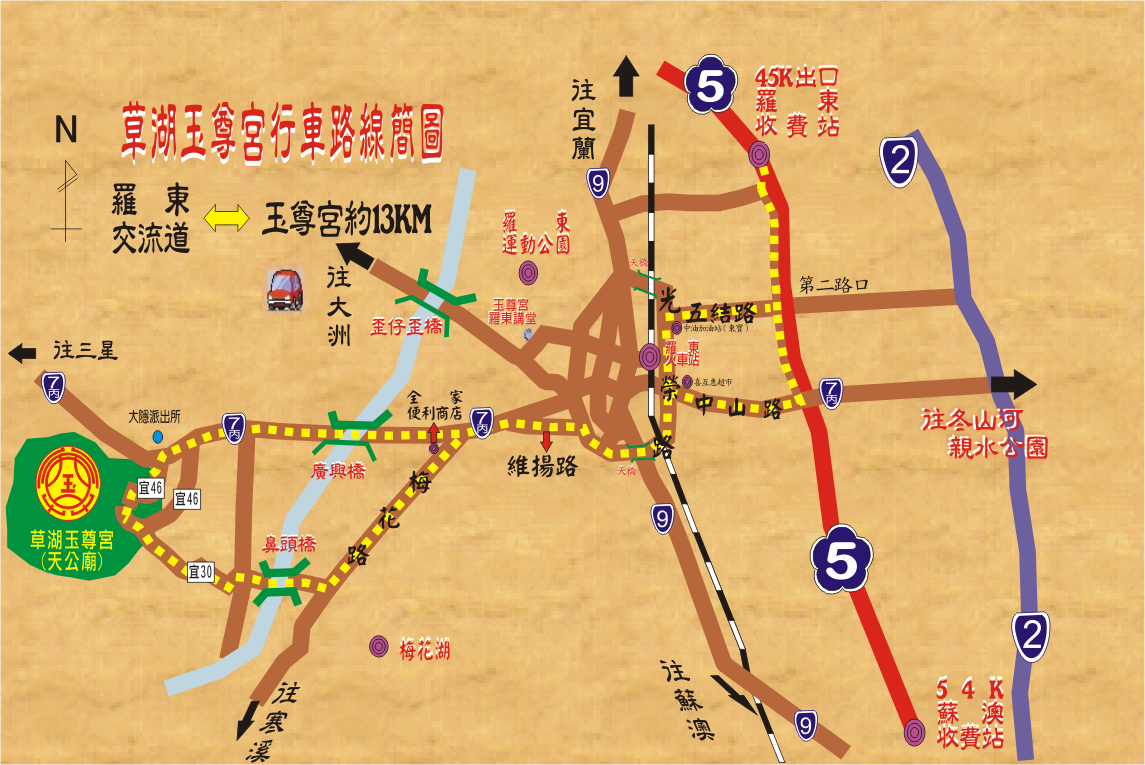 玉尊宮坐落於冬山鄉西北方的草湖山,海拔150公尺草湖山麓,與三星鄉連接,離羅東西南方約六公里,。冬山鄉居於蘭陽平原東南,東濱太平洋,南臨中央山脈,由於背山面海,綠樹掩翠,景致非常秀麗。各地香客可經羅東搭車到達。(請參考行車路線圖)